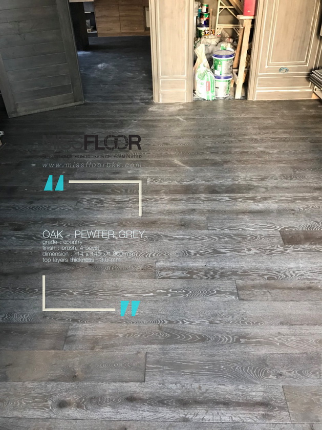 พื้นไม้จริงเอ็นจิเนียร์ "โอ๊ค" ย้อมสีเทาดำ เปิดเสี้ยนขาว (พื้นผิวหน้า หยาบ-ขรุขระ)