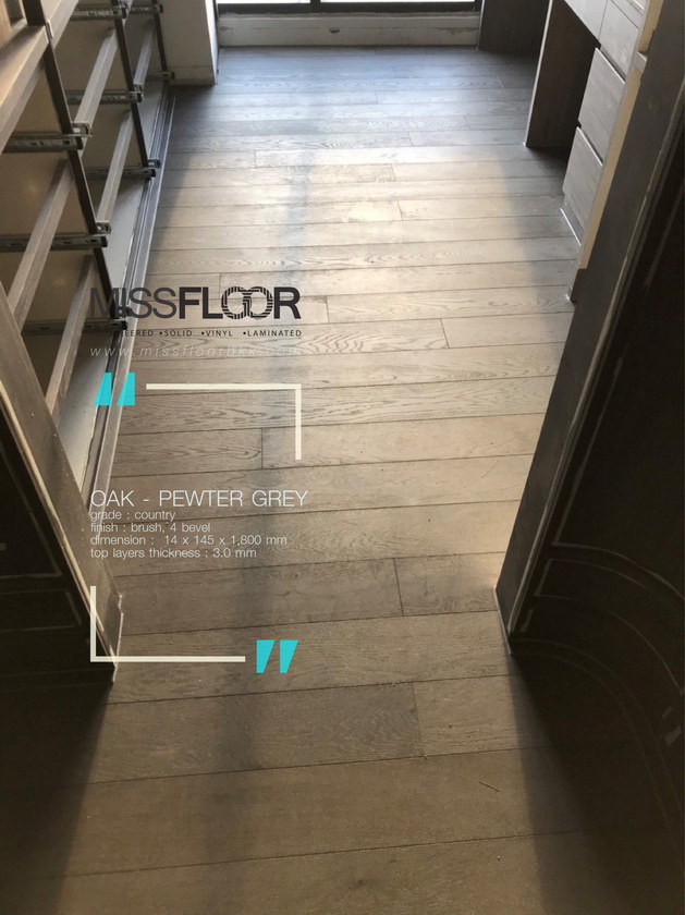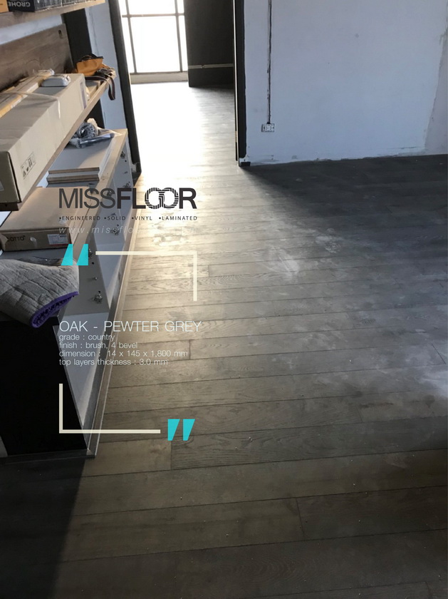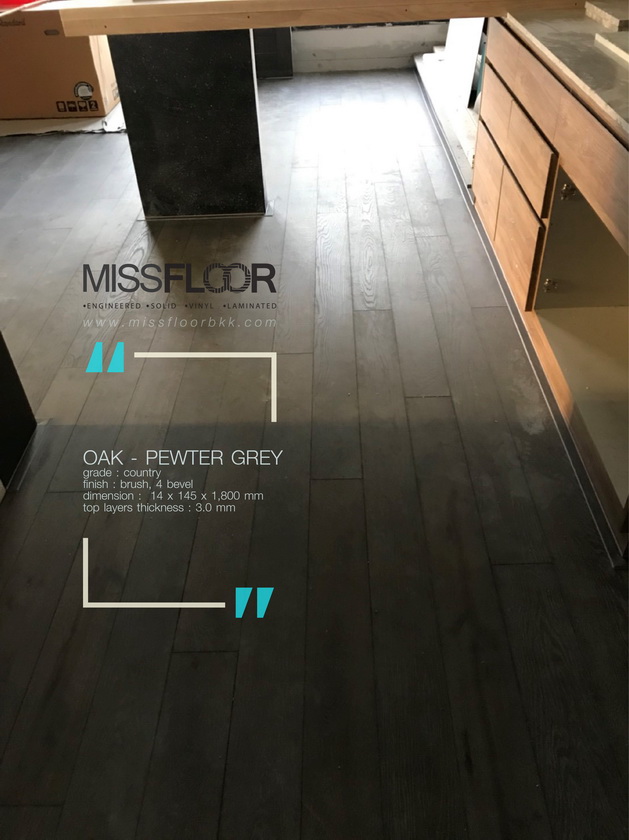 พื้นไม้จริงเอ็นจิเนียร์ "โอ๊ค" ย้อมสีเทาดำ เปิดเสี้ยนขาว (พื้นผิวหน้า หยาบ-ขรุขระ)