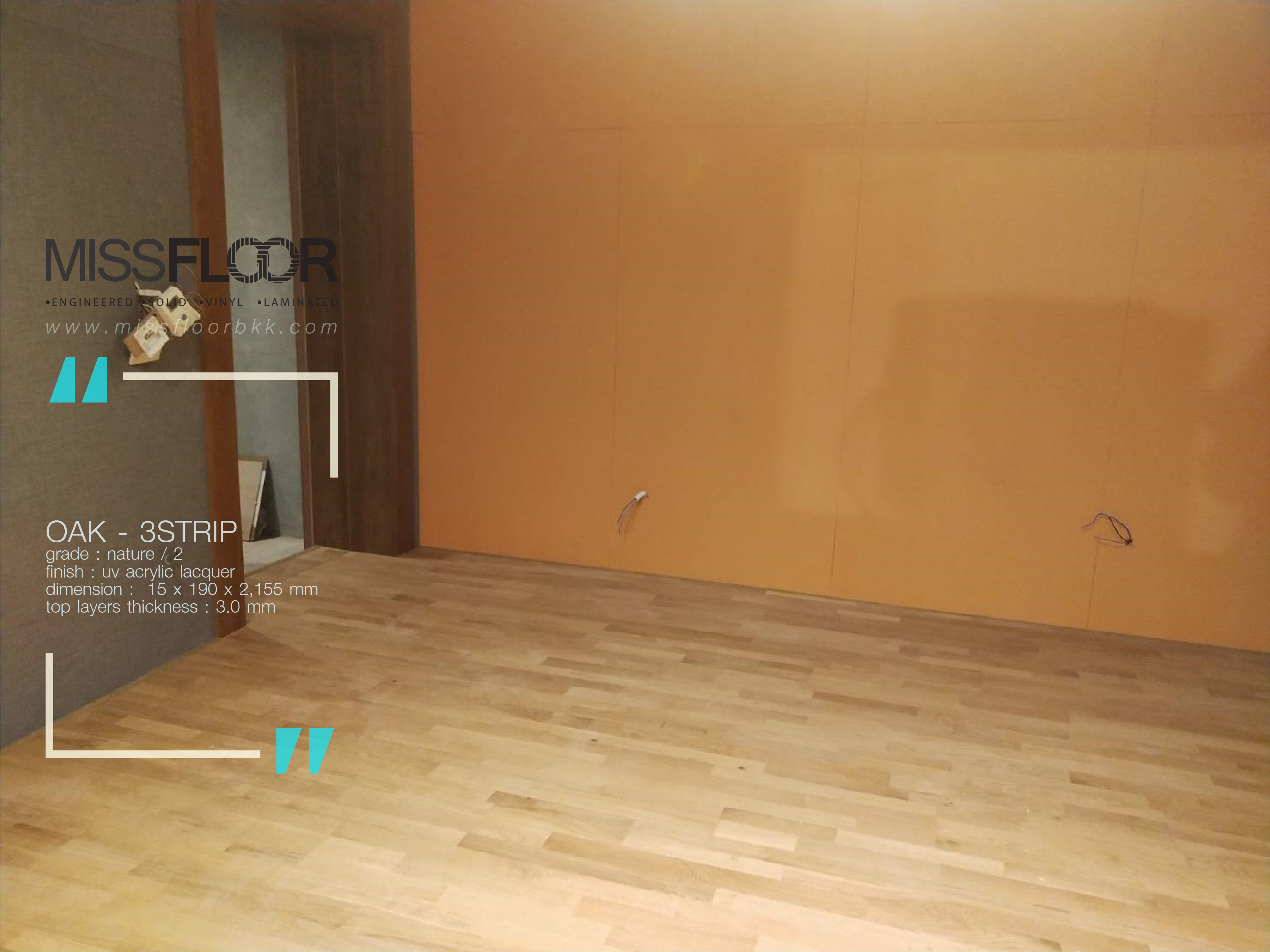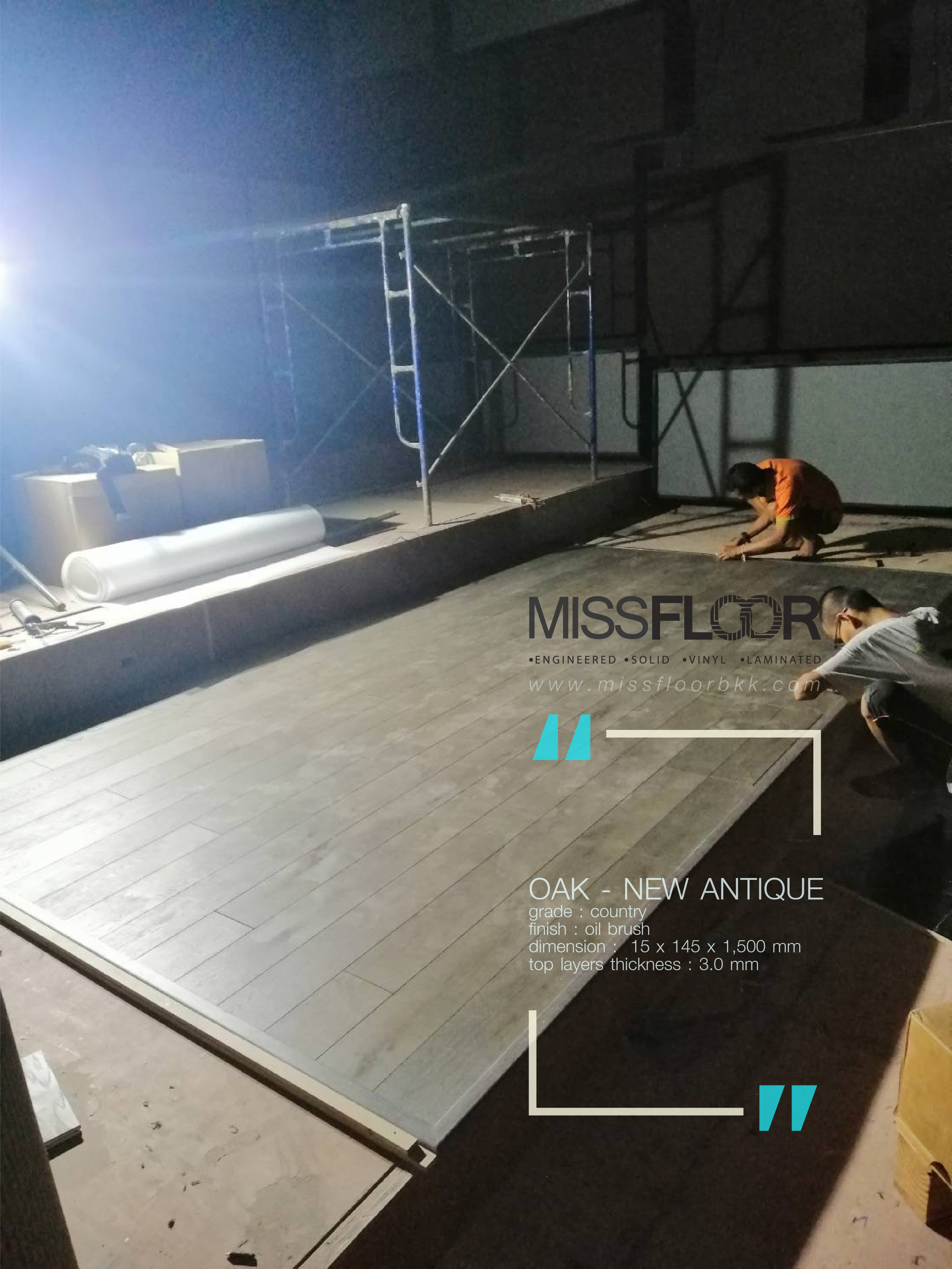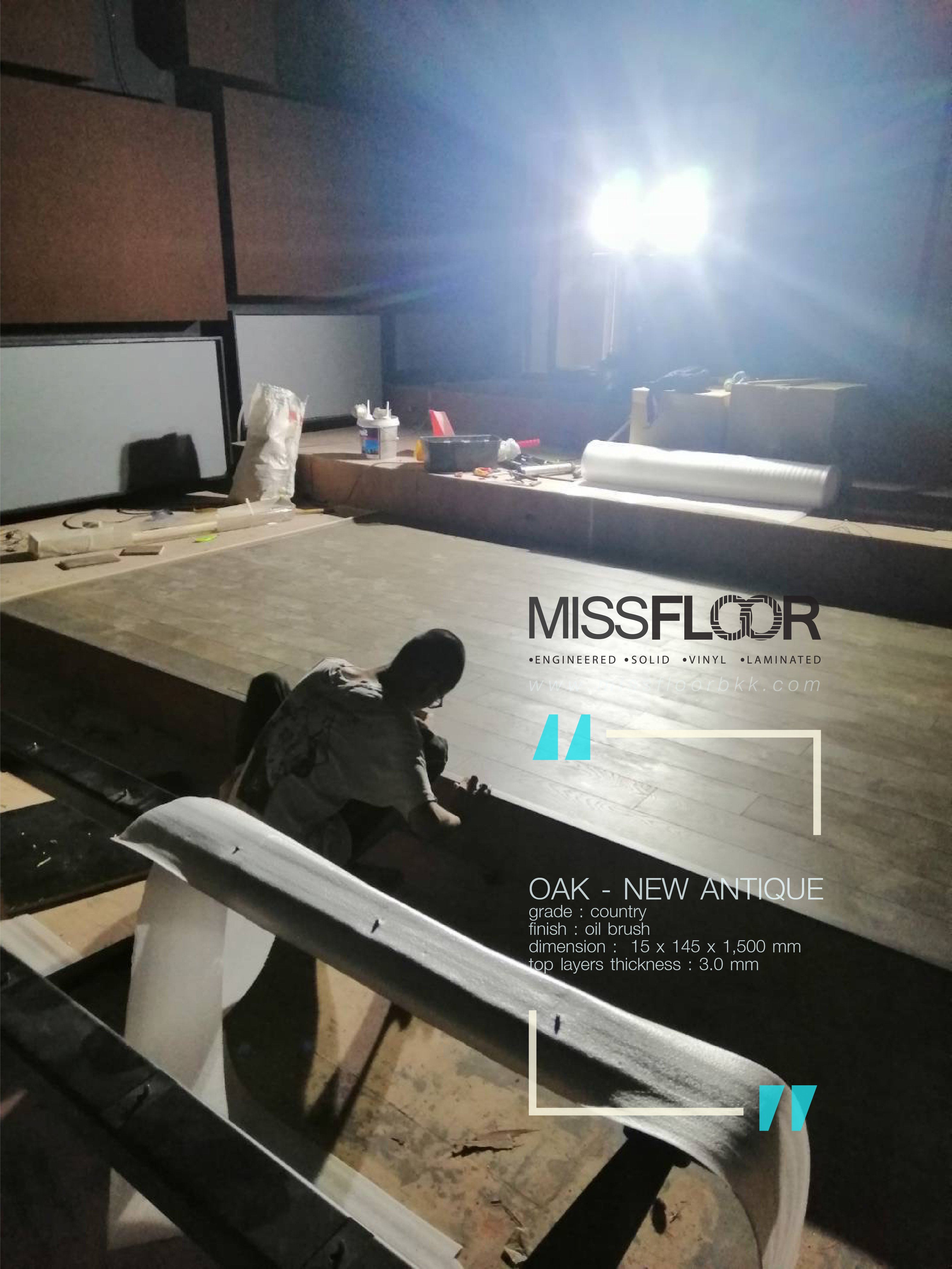 ผลงานติดตั้งพื้นไม้จริงเอ็นจิเนียร์ "ไม้โอ๊ค" สีธรรมชาติลายปาร์เก้ กับ ย้อมสีเทาเข้ม "กันตานา"
